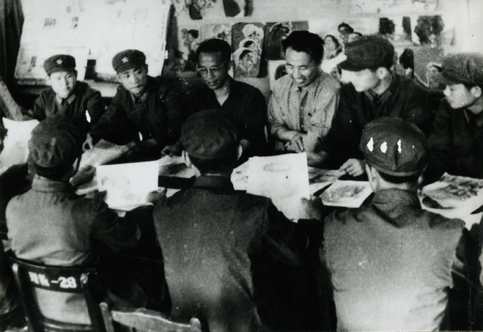 1977年在学军活动中梁敬泗、张启新老师为空军部队美术宣传干部上专业辅导课。