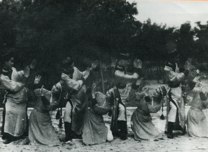 1962年音乐系舞蹈专业学生在校园内精心排练蒙族舞《欢乐的青年》。