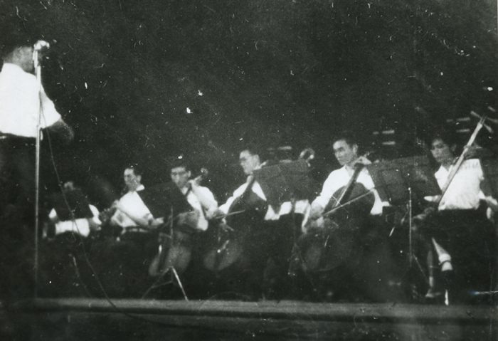 1959年学校据举行建国十周年公演。这是器乐合奏《沂蒙山》金光沃老师指挥。