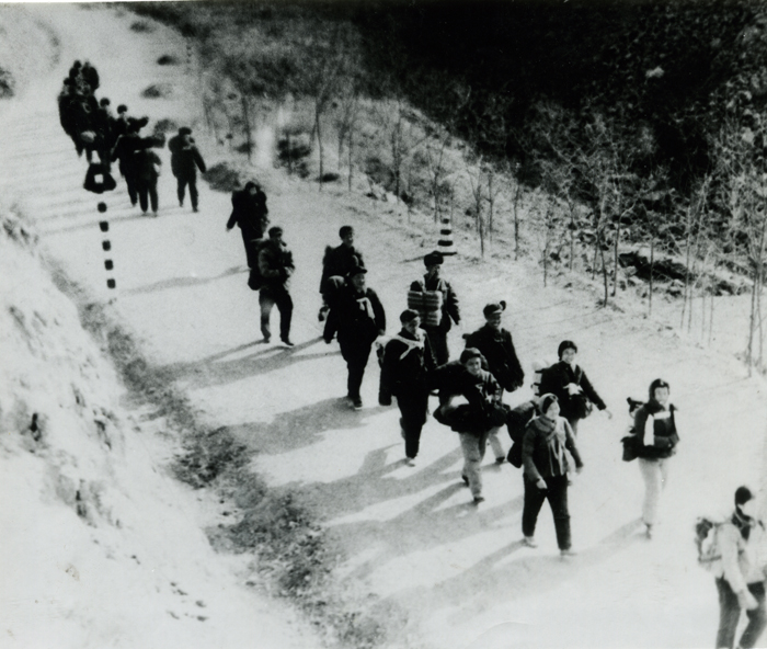 1970年严冬季节我校教职工参加省直文化系统宣传队,图为拉练途中。
